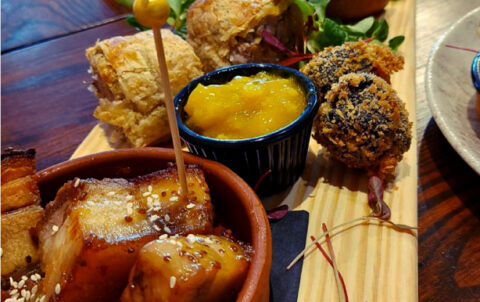 Black pudding and parmesan bon bons Artisan pork pie Homemade sausage roll ...
